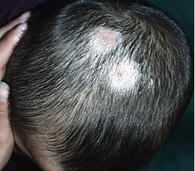 2、黄癣:每个年龄段都有可能会出现,但是孩子感染的几率比较高,典型皮损为盘状黄豆大小的黄癣痂,中心贯穿有毛发,病发参差不齐,干枯无光泽,愈后形成萎缩性疤痕,永久性秃发。